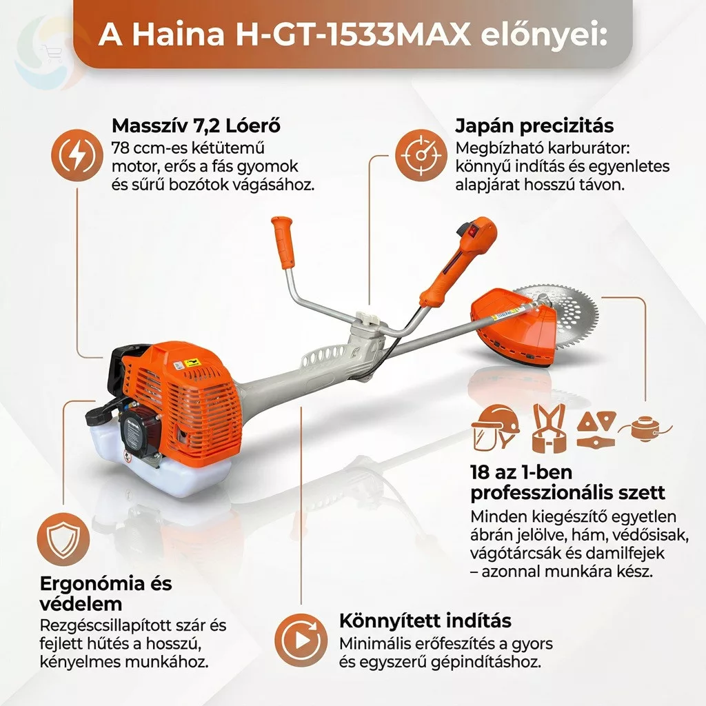 Haina H-GT-1533MAX Benzines Fűkasza és Bozótvágó - 7,2LE, 18 kiegészítővel